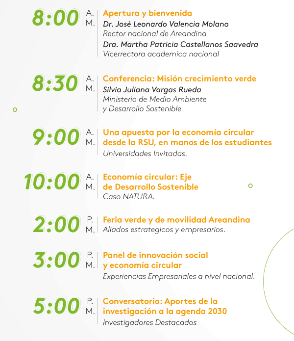 La Fundación Universitaria del Área Andina de Colombia (Areandina) celebró el Día de la Sostenibilidad Areandina que se enfocó en la economía circular como eje de Desarrollo Sostenible. El día 24 de de septiembre hubo actividades desde las 08.00 hrs hasta las 17.00 hrs, todas con la temática de economía circular. A continuación te dejamos las actividades que se realizaron: