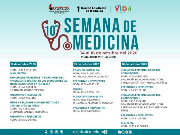 A partir del día 14 de octubre hasta el 16 de octubre la Universidad de Xochicalco, Campus Tijuana, llevará a cabo la décima versión de la Semana de Medicina. En el evento se realizarán charlas y talleres gratuitos en modalidad virtual con el objetivo de conectar a profesionales de la salud con estudiantes de forma directa. Para asistir a las actividades puedes inscribirte aquí. A continuación te dejamos el cronograma de la Semana de Medicina.