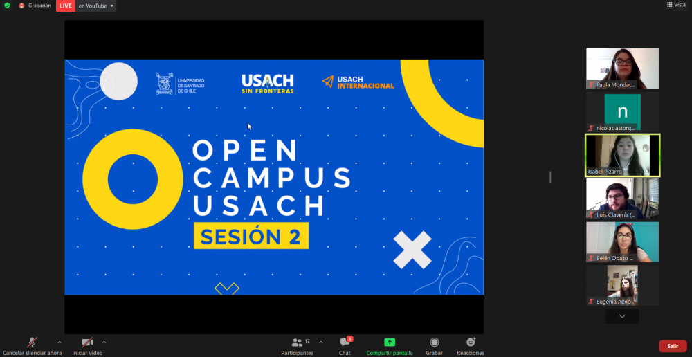 El jueves 12 de noviembre, se realizó la segunda sesión de “Open Campus - Del Mundo a la Usach”, una actividad virtual que es parte del programa Usach Sin Fronteras del Departamento de Relaciones Internacionales e Interuniversitarias (DRII) de la Universidad de Santiago de Chile (Usach). La actividad estuvo dirigida a estudiantes internacionales para que conocieran los aspectos académicos, sociales y culturales de la institución.