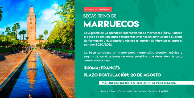Por medio del presente correo, adjunto envío convocatoria de ofrecimiento de 6 Becas para estudiantes que deseen realizar una formación en instituciones públicas marroquíes de educación superior, técnica y profesional, para el año académico 2021.