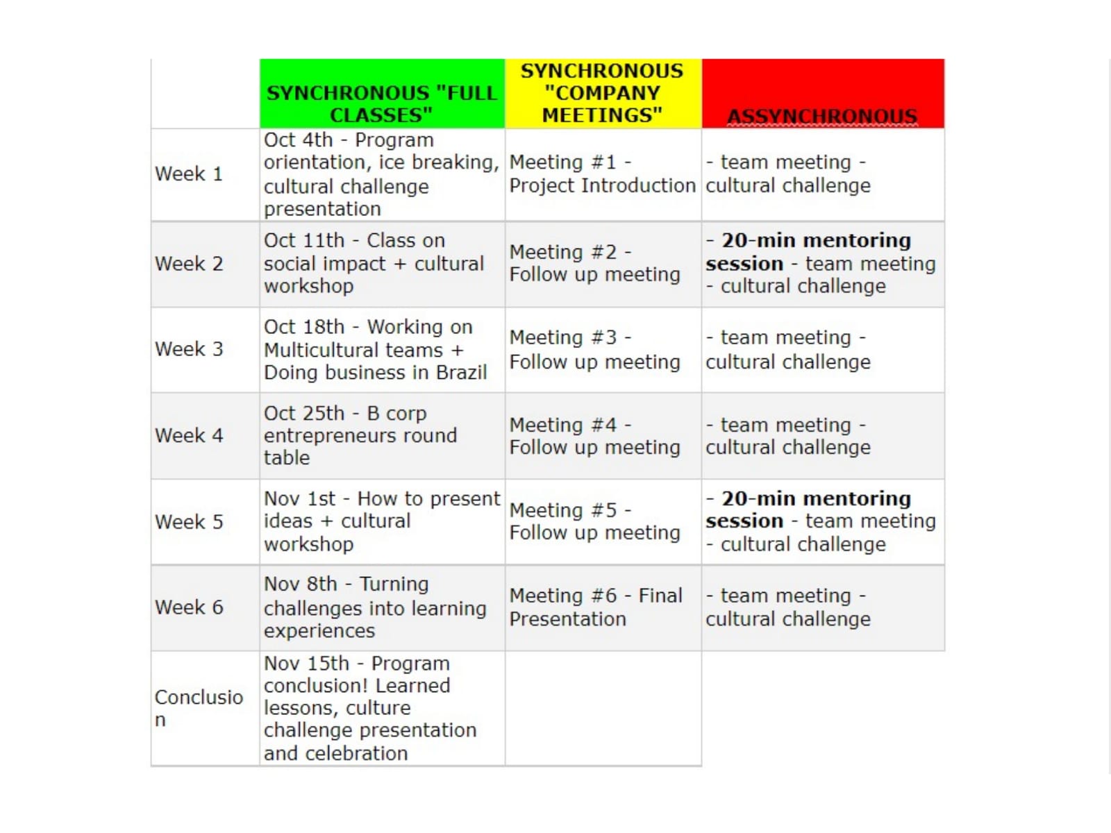 Todos los lunes los estudiantes tendrán interacción de 6:00 a 7:00 pm (EST) y para la empresa, las reuniones serán los miércoles o jueves a las 9:00 am, 1:00 pm o 4:00 pm (EST). El programa tendrá una estructura de 40 horas.